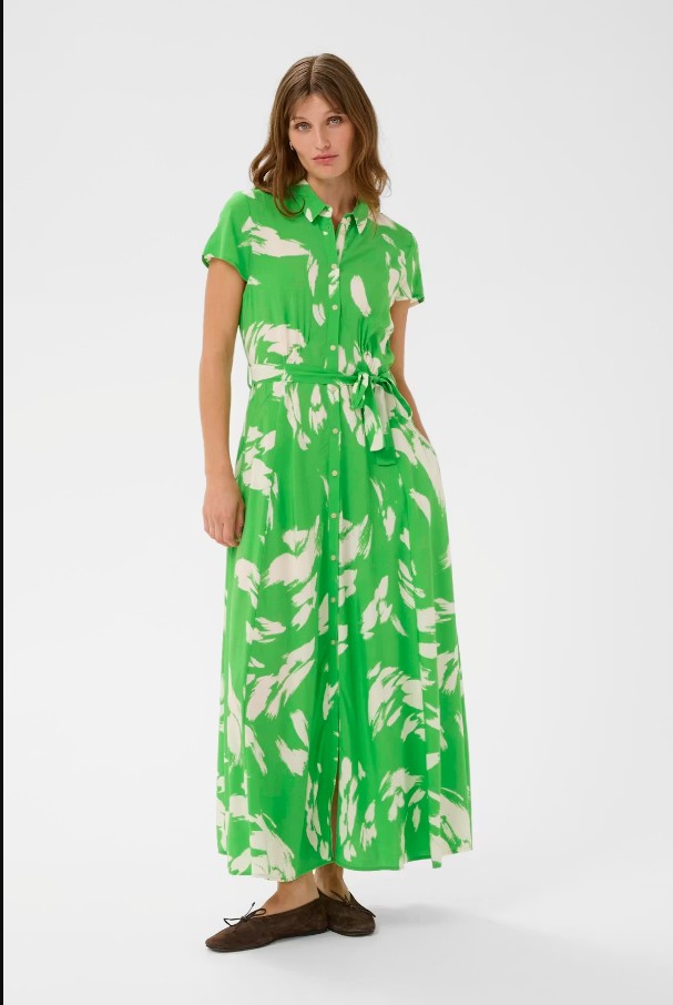 Este vestido camisero presenta un corte recto, cuello clásico, mangas cortas y una botonadura completa al frente. Un cinturón a juego define la cintura, mientras que su largo maxi fluido crea una silueta relajada.